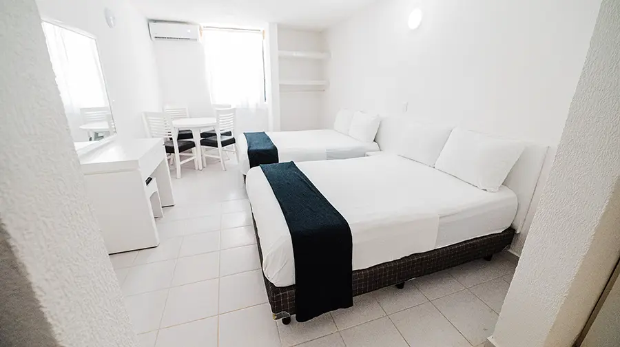 Bienvenido a nuestra suite Junior, donde la comodidad y la serenidad se encuentran para crear una experiencia confortable. Esta espaciosa habitación está diseñada para alojar cómodamente a cuatro personas, ofreciendo dos cómodas camas matrimonial y su cocineta. Cada detalle ha sido cuidadosamente seleccionado para brindar un ambiente relajante y acogedor.
